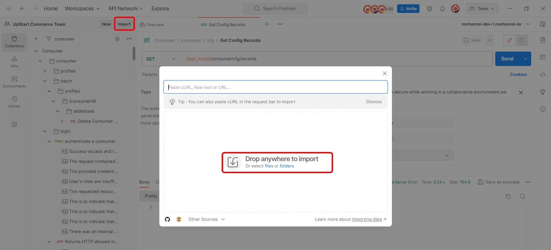 this section outlines a step by step process of installing postman, obtaining upstart commerce apis, importing them as collections, and setting up the postman environment what is postman? postman is a tool for building and using apis with postman you can build and customize http requests, store request templates, and collaborate with others it supports various http methods, headers, parameters, and authentication methods, enabling you to simulate different scenarios setting up follow these steps to download our openapi specification (oas) files, import them into postman, and commence testing upstart commerce apis step 1 install postman to install postman, follow the installation guidelines available at the https //learning postman com/docs/getting started/installation/installation and updates/ step 2 download the openapi yaml file visit our " https //apidocs upstartcommerce com/ " all our service apis are listed under the "restful api documentation" section click on the service you are interested in exploring click on the "export" button at the top right corner select " bundled references " from the dropdown menu to download the open api yaml file, offering a comprehensive set of endpoints, request parameters, and examples for api functionality step 3 import the file to postman launch postman, the api development and testing tool click on "import" at the top left corner to open a modal window select or drop the previously downloaded "open api yaml file" from your local storage now, choose how do you want to import the "open api yaml file" you can opt for either a "postman collection" or "open api 3 1 " with a postman collection by selecting the radio button click on "view import settings" on the modal in the folder organization, select "tags " this ensures the creation of folders for consumer and management apis at last, click on "import" again, confirming the successful import into the postman step 4 configure environment variables to configure your environment, click on the "environments" button located in the side menu if you are setting up variables for a new environment, click on "add" to create a new environment for existing environments, add the following environment variables necessary for your upstart commerce instance if your company has a development instance already, please check with your technical lead for the corresponding values of these variables if you have not established a tenant id and site id, and you want to create a sandbox environment to explore our apis, go to https //sandbox nochannel io/setup/create the email generated during this sandbox setup will provide you with the necessary values for these environment variables base url configure the "baseurl" to the api host of your instance plus /v1 example https //apihost com/v1 tenant id and site id configure the environment variables, tenant id, and site id according to your company's development or sandbox environment further on, set {{tenant header field name}} and {{site header field name}} header of each request finally, "save" the environment configuration once the collection is imported and configured, you can explore the upstart commerce apis further we suggest you to browse endpoints review the collection to understand available endpoints and functionalities test requests execute sample requests to observe api responses and understand the data structure modify and experiment modify requests to suit your specific use cases and experiment with different parameters